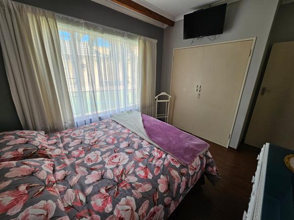 The entertainment area is ideal for hosting family and friends, featuring a built-in braai, built-in lounge area, and a loft space, creating a unique and relaxed atmosphere that flows out to the sparkling swimming pool and well-maintained garden.