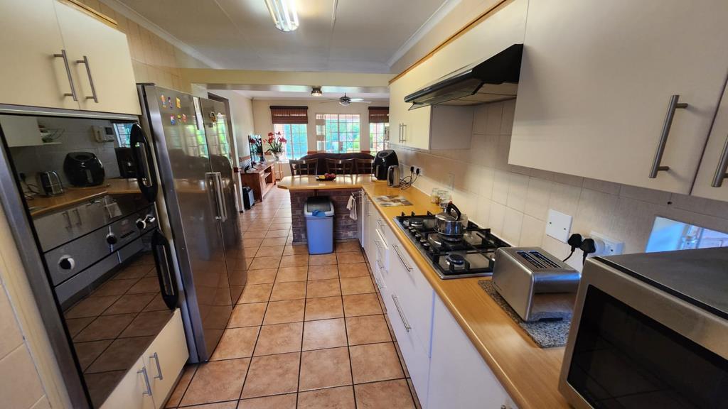 The open-plan kitchen with a gas stove is well-appointed, with plentiful cupboard space, and is complemented by a separate scullery and laundry area. The two garages, equipped with automated doors, are conveniently linked to the main house via an internal door, providing seamless access.