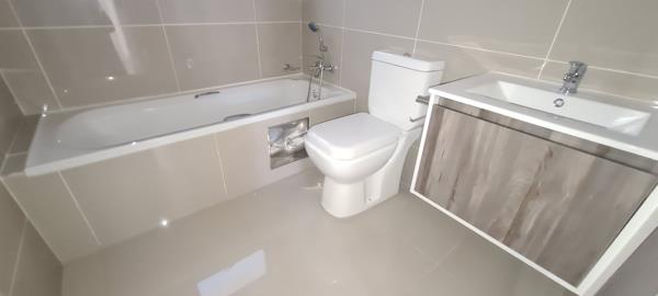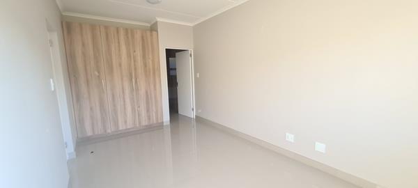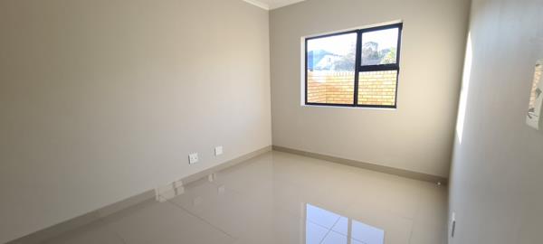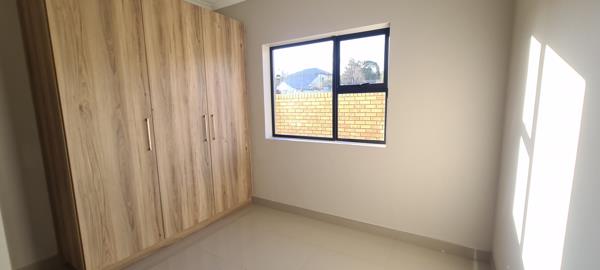 2 spacious, fully tiled bedrooms with built-in cupboards, main bedroom includes a sleek en-suite bathroom.