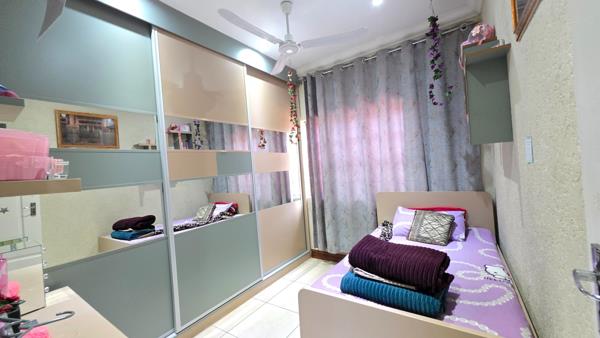Bedroom 2 laminated flooring, built in cupboards, and ceiling fan.