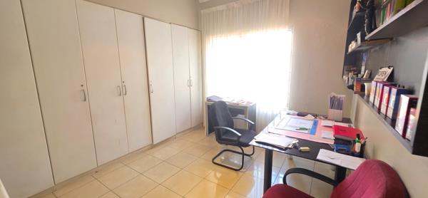 The bedroom wing is neatly arranged along a passage, with an elongated scullery running in line alongside it, offering extended utility space. The first and second bedrooms are tiled and fitted with built-in cupboards. A communal bathroom services this section of the home and includes a shower and toilet. The third bedroom is also tiled with built-in cupboards and is fitted with an air conditioning unit. It features an en-suite bathroom complete with a jacuzzi, shower, toilet, and double basin.