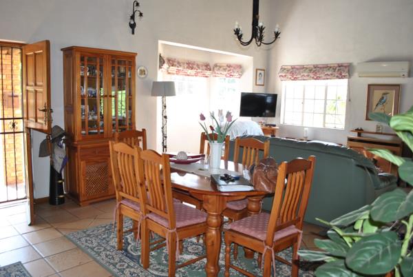 The entertainment area is the glue that keeps the kids entertaining at home. The large overhanging open lapa adjacent to the kitchen has a built in server and ends in the sparkling pool. Mom''s rose garden with a lovely silent corner flows from here.