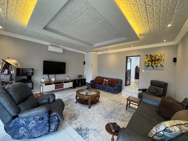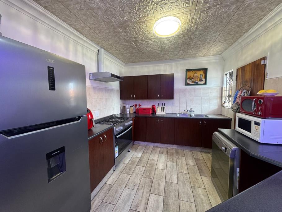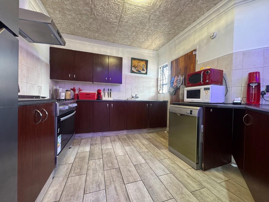 The home comprises three comfortable bedrooms and two well-appointed bathrooms, with one being an en-suite for added privacy. Bathrooms feature clean fixtures, with some showcasing modern black tile accents. For enhanced security, the property is fitted with CCTV, electric fencing, and security bars on windows.