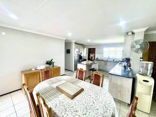 Outdoor living is a highlight, with a fully enclosed garden, swimming pool, patio for entertaining, and a Wendy house for extra storage. Parking is ample with a lock-up garage and four covered carports.