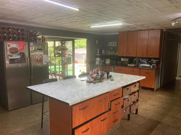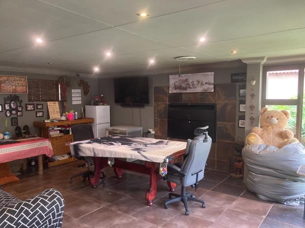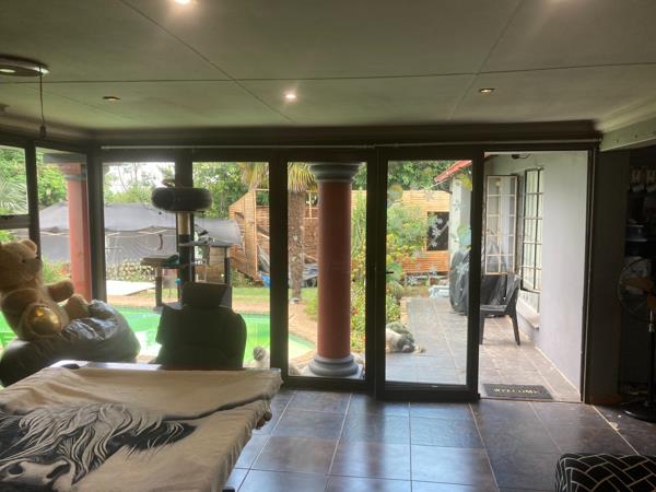 A spacious open-plan layout featuring a family room with a built-in braai and stack doors that open to the garden and pool area.