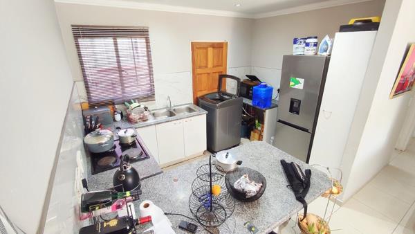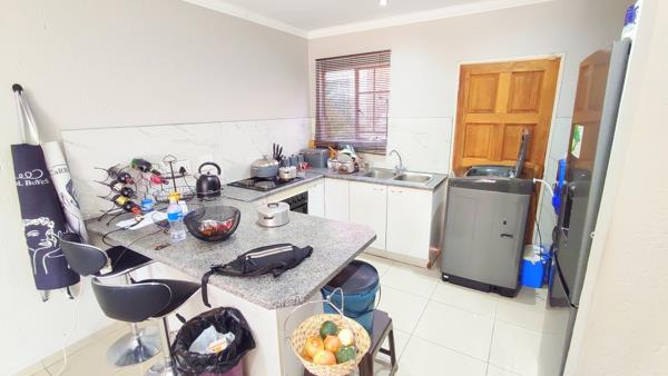 Step inside through the sliding door into a welcoming living area that flows seamlessly into a fresh, modern open-plan kitchen. The kitchen offers ample cupboard space, a breakfast nook, an electric touch stove with a sleek extractor fan, and even a double wine rack ideal for entertaining.