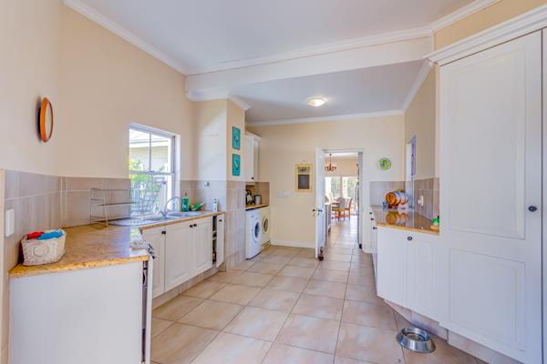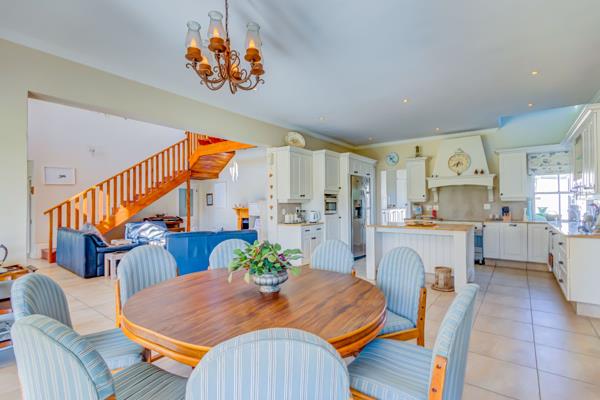 Upon entering the main residence, you are greeted by a grand entrance hall that sets the tone for the rest of the home. The principal floor includes a guest cloakroom and a formal lounge, perfect for entertaining guests in a sophisticated setting. The heart of the home is the expansive open-plan area, comprising an informal lounge, a country-style kitchen, and a dining room. This space flows effortlessly onto a vast covered patio, offering breathtaking views of the extensive garden. The kitchen is complemented by a large separate scullery, which provides convenient access to a dedicated veggie garden.