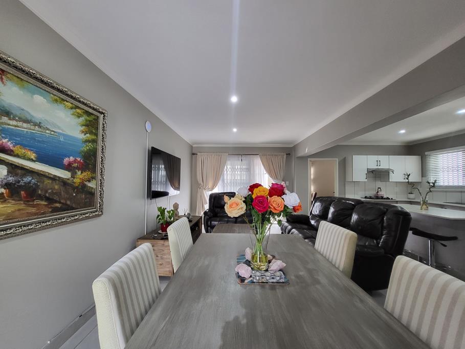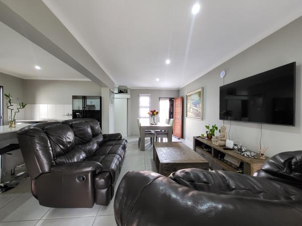 A seamless open-plan space consisting of the dining room and lounge. The lounge flows effortlessly onto a covered patio, creating the perfect indoor-outdoor living experience.