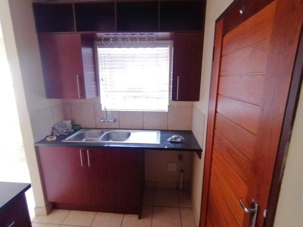 This 3-bedroom house is situated in a cul-de-sac in the 24/7 secured Waterberg Fields Estate in Kosmosdal. You enter at the main entrance through a Trellidor security gate into the open plan living area. The kitchen is open plan with cupboards with granite tops, a sink with double basin, undercounter oven with hob, and washing machine outlet. The kitchen has a door opening onto the back garden.