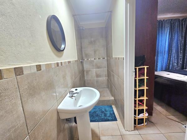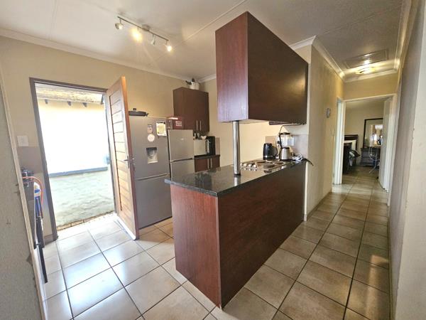 The residence is meticulously designed for comfort and functionality. The interior layout encompasses three well-proportioned bedrooms and two bathrooms, including a private en-suite for enhanced convenience. A dedicated lounge area provides a central space for relaxation and social engagement, complemented by a functional kitchen. The open plan kitchen has granite tops and space for a double door fridge and washing machine. The property includes a garage, carport, fibre and a solar geyser, contributing to energy efficiency and reduced utility costs.