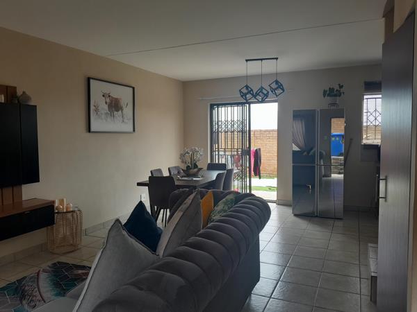 Step in quiet and calm lock up and go secure complex inside The Cosmos Estate. A beautifully maintained complex with 24 hour guard, with CCTV cameras that offers you a peace of mind. Inside tiled floors lead through a spacious open plan lounge, dinning room and kitchen complete with undercounter oven, and space for your trusted appliances, having three generous bedrooms. Two bathrooms, with one on the ground floor with shower at the convenience of your guests, and the other upstairs with a tub.