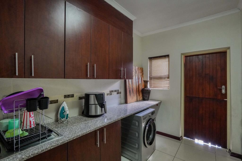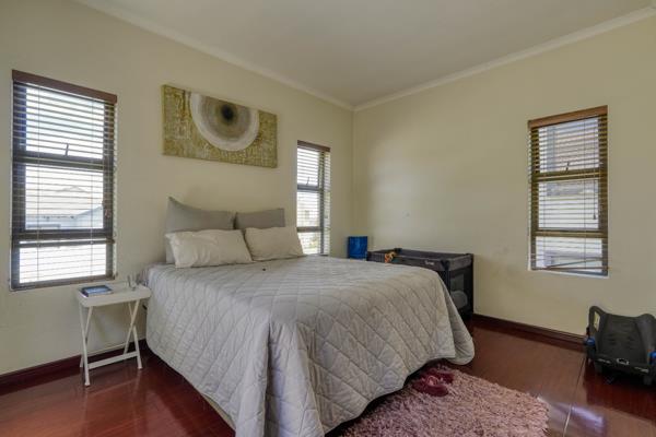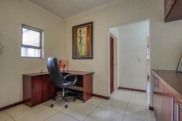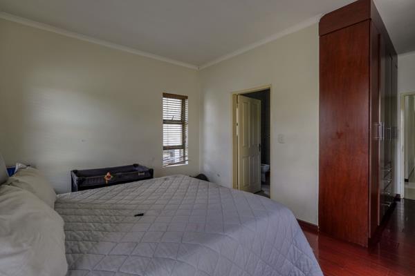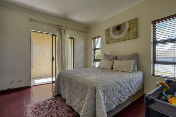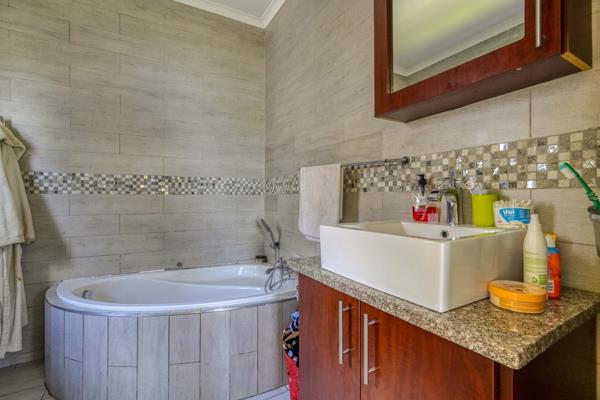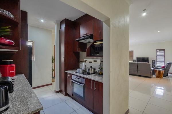 The master bedroom features its own en-suite bathroom, while the remaining two bedrooms are served by a separate bathroom, making the home practical for family living. The kitchen connects directly to the lounge and dining area, creating an easy flow through the living spaces. From here, doors open out to the front patio, where a built in braai provides a great spot for relaxed outdoor entertaining.