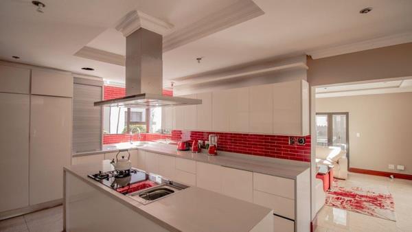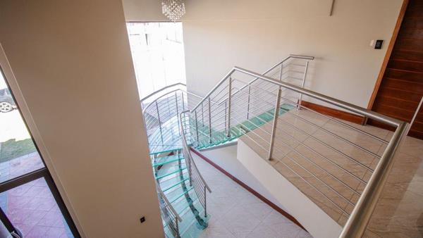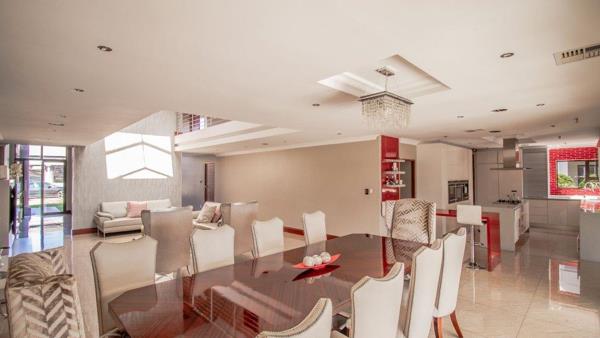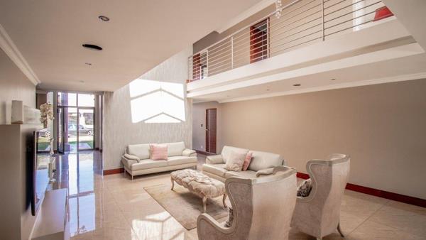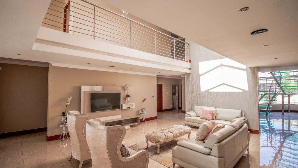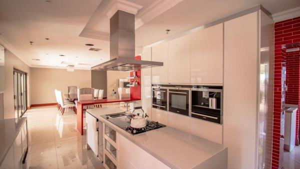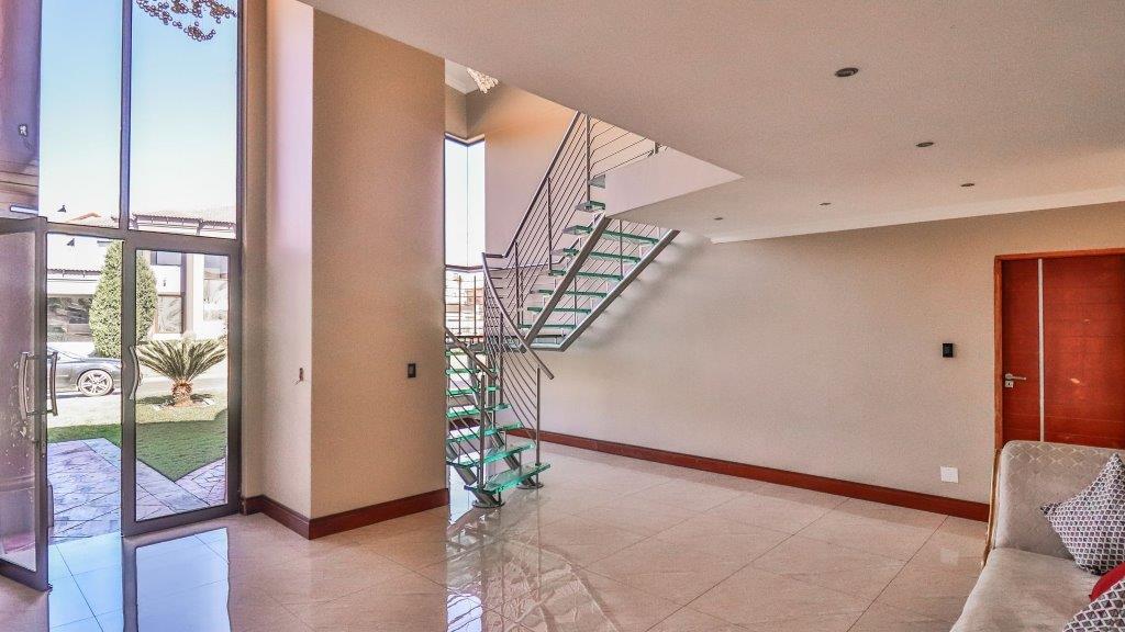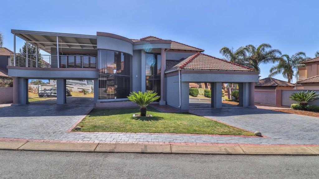 Opportunity galore at this modern home with a bit of everything offering a wide range of amenities. The double volume entrance with high ceilings flows onto reception, family room, dining area kitchen with caeser stone tops, pantry, scullery, formal lounge, surround sound system and piped for automation, guest loo, guest bedroom with an en suite bathroom. First floor lands on the pajama lounge flowing on gym and study area, 4 bedrooms all en suite, main with a walk in closet. The home boasts 4 automated garages, staff accommodation, patio with built in braai, swimming pool and one of the biggest yards on the estate. It is key to note that the home requires a bit of tender love and care to complete some of its aspects and features.