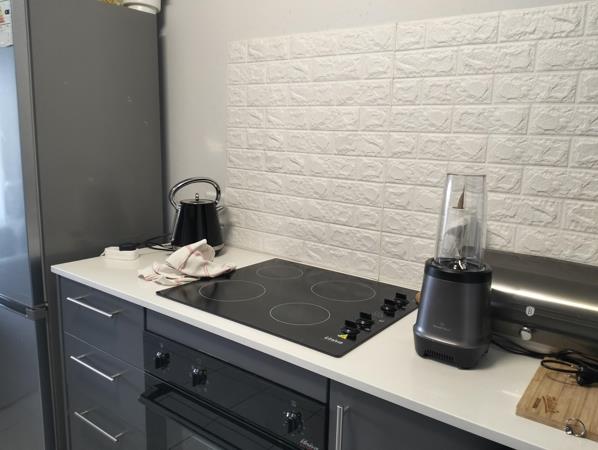On entering this flawless 1st floor apartment, you are welcomed by a spacious living area. Then you get into an open plan kitchen with natural wood finished cabinets. A breakfast nook with ample cupboards space. You also get enough space for your appliances.