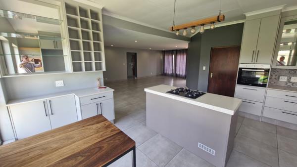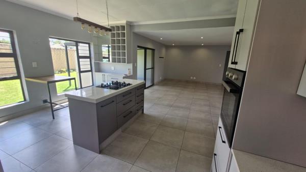 The interior features an open-plan layout, seamlessly connecting the living and kitchen areas. Modern light-colored tiled flooring, recessed lighting, and neutral grey walls create a contemporary ambiance. The kitchen is a highlight, equipped with grey cabinetry, light countertops, a central island with a gas hob, a built-in oven, and ample storage including a pantry. Large windows and sliding doors ensure abundant natural light throughout.