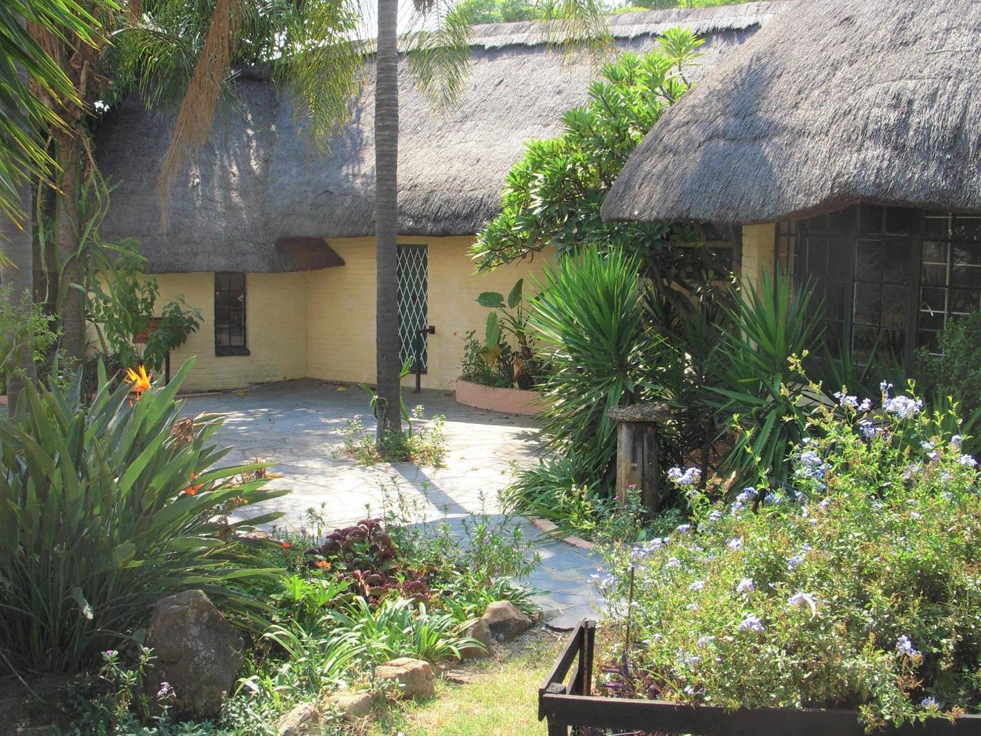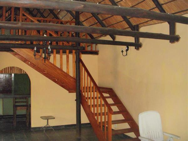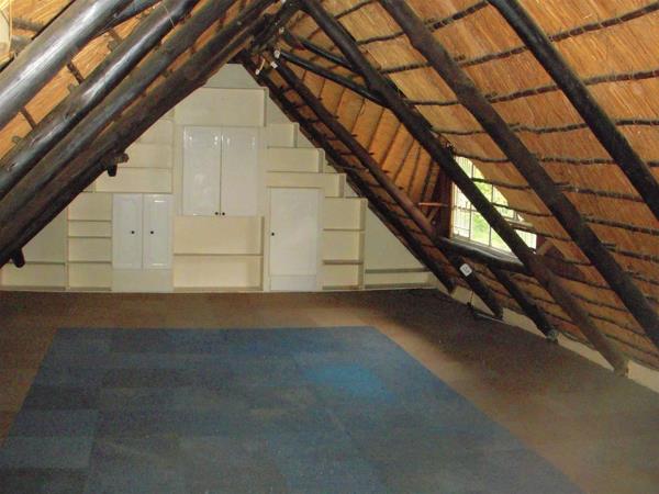 Loft room with small concealed storage space under the thatch roof plus three bedrooms, main with walk in closet and small patio. Two bathrooms with shower in bath, main bedroom en suite.