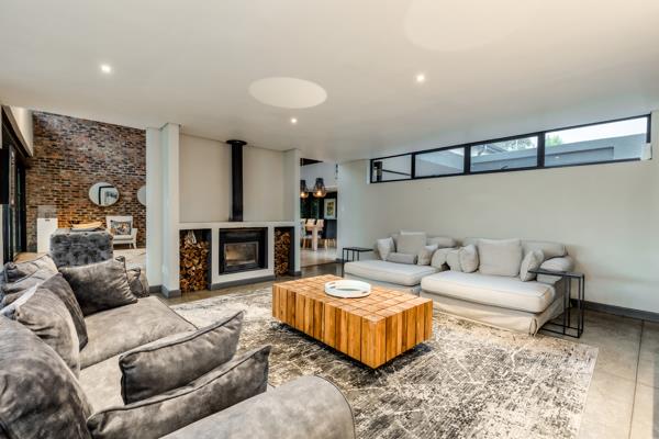 The living area strikes the perfect balance between open-plan dining and lounging, flowing seamlessly onto the outdoor patio, while also offering a cosy corner family room filled with natural light and warmed by a double-sided fireplace. The outdoor patio is generously sized, featuring a built-in braai and pizza oven overlooking the sparkling pool. An absolute treat is hidden at the end of the garden a forest boma for memorable campfire evenings. Beyond the rim-flow pool lies a beautiful pond, attracting abundant birdlife just beyond the fenced garden.