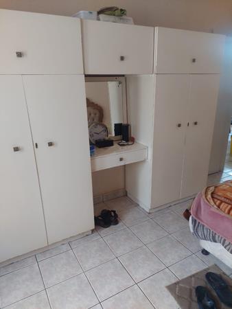 The main bedroom is spacious and includes built-in cupboards, tiled flooring. there is one additional spacious bedroom and a porch that can be used as a bedroom or sunroom/study/prayer room, each with cupboards, tiled flooring, and access to a shared bathroom.