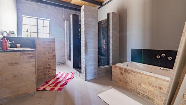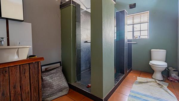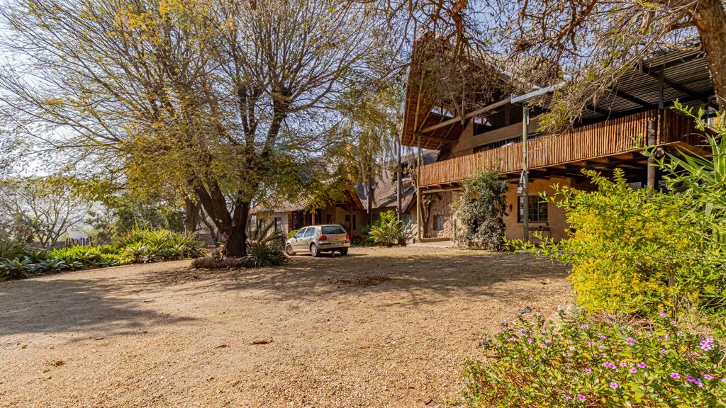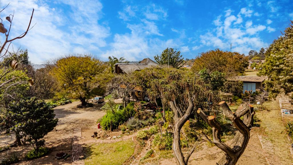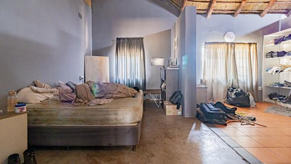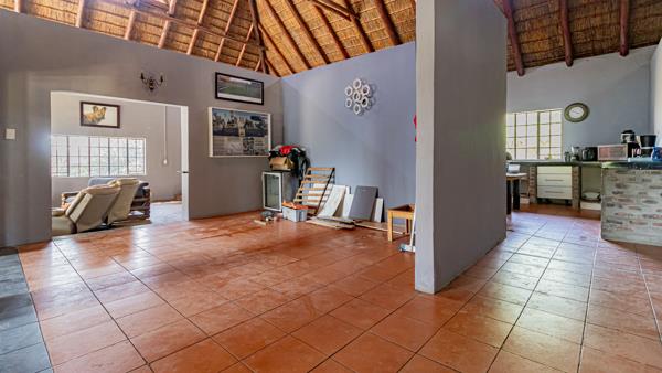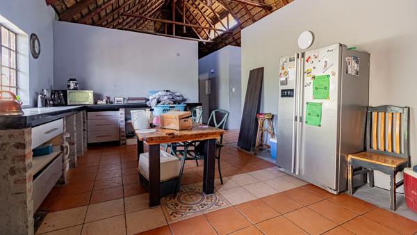 The main house is a charming thatch-roofed residence that promises a warm and inviting atmosphere. The heart of the home is a spacious open-plan area that includes a large, functional kitchen, a comfortable lounge, and a dining room. Floor-to-ceiling glass windows and patio doors fill the space with natural light and provide seamless access to a beautifully manicured garden.