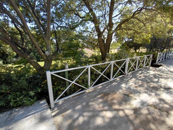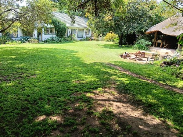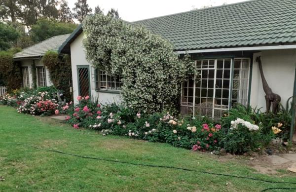 The home is enveloped by settled gardens featuring perennial borders over-flowing with red, white, yellow and purple blooms, with ever-present, fragrant roses inviting one to stop and smell them. The lawns are soft and meticulously maintained and serve as a calm centre-point that rolls away from the front patio towards the tree-lined border fences, creating a park-like, serene and tranquil setting. The patio at the north-facing front of the house is an idyllic place to start a new day, coffee and croissants served on tables with its mismatched wooden chairs.