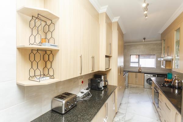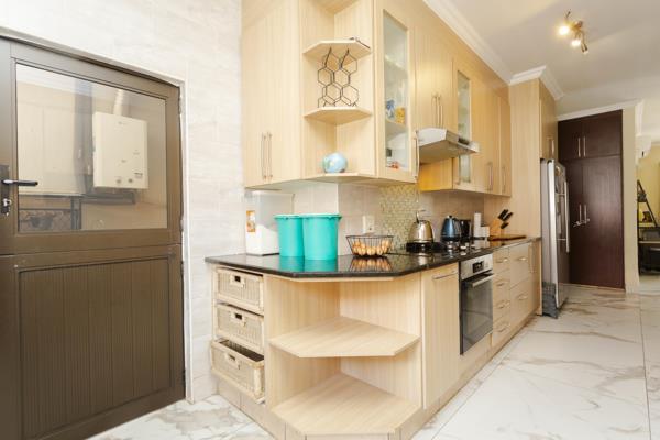 The dinning fits an 8 seater table with space to move around when serving. In the kitchen youll find a modern kitchen unit with a granite top and ample cupboard space due to the L-shape design. It also features openings for a double door fridge, microwave and 3 under counter appliances.