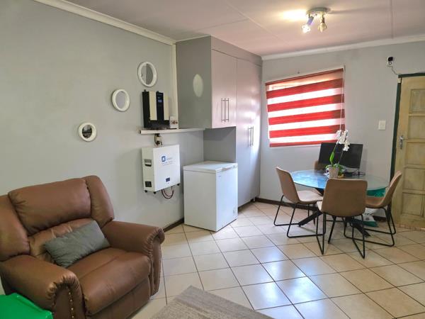 Moreover, this fully tiled residence includes extra accommodations for a nanny or student, complete with its own bedroom and en-suite bathroom, offering potential for additional income. The property is equipped with six solar panels, a 7.5KVA inverter, and a 5.2KW lithium battery, ensuring energy efficiency. Plus, the levies cover water usage, garden services, and building insurance.