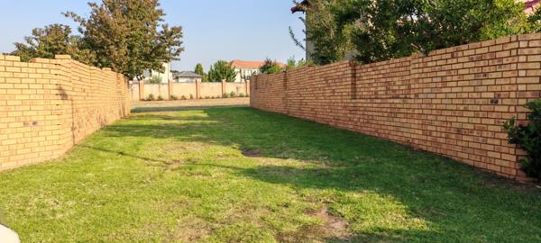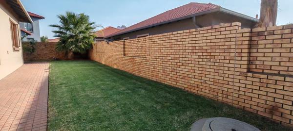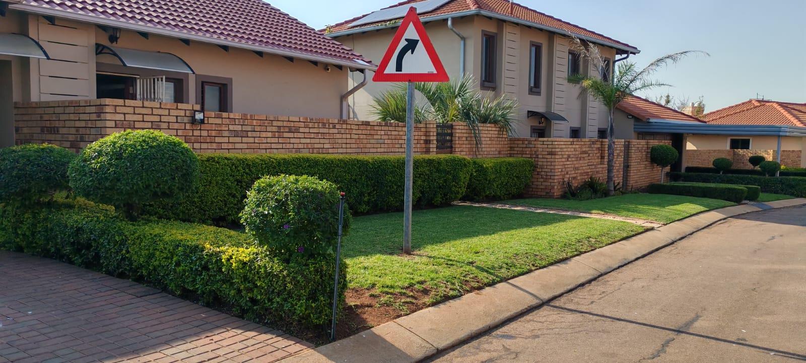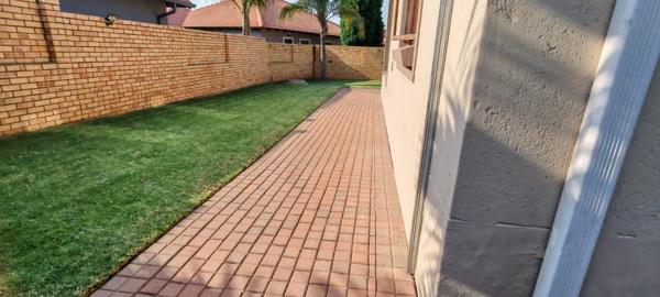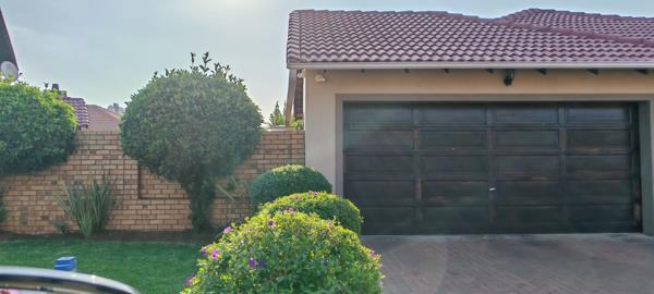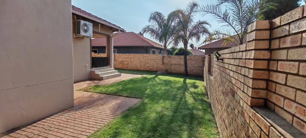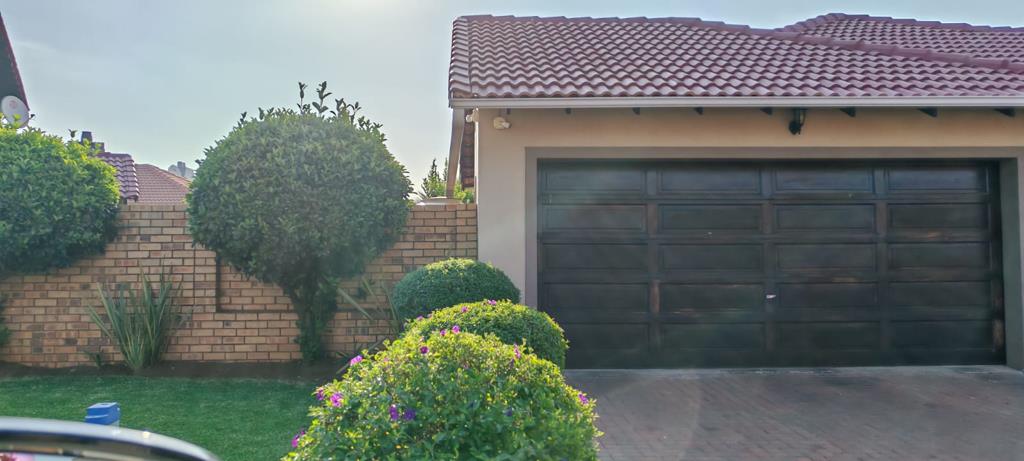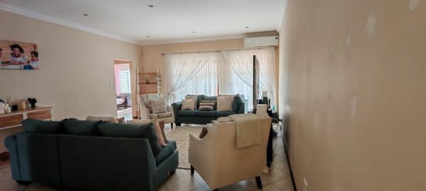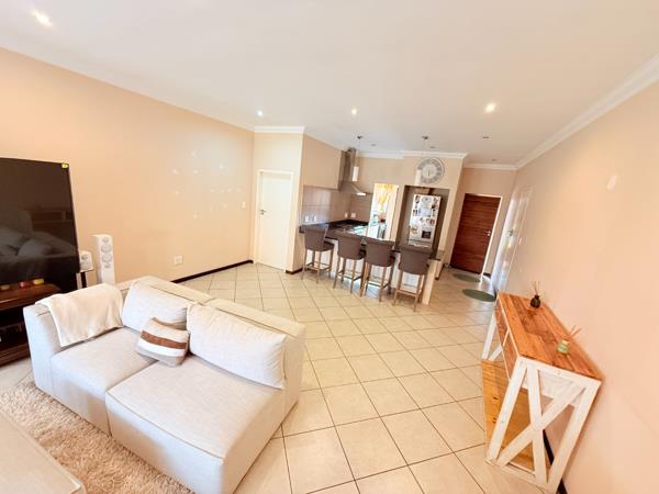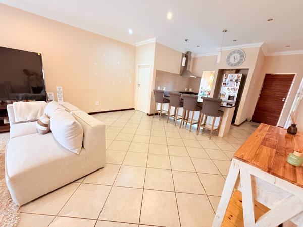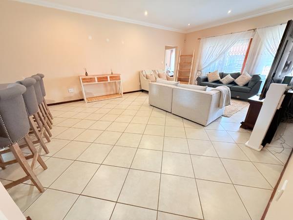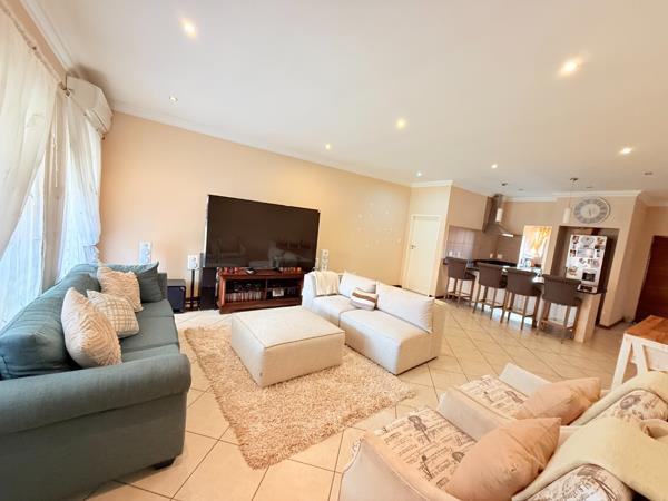 An open plan living area and dining room leading up to a sliding door opening to a braai patio overlooking a immaculate spacious garden.