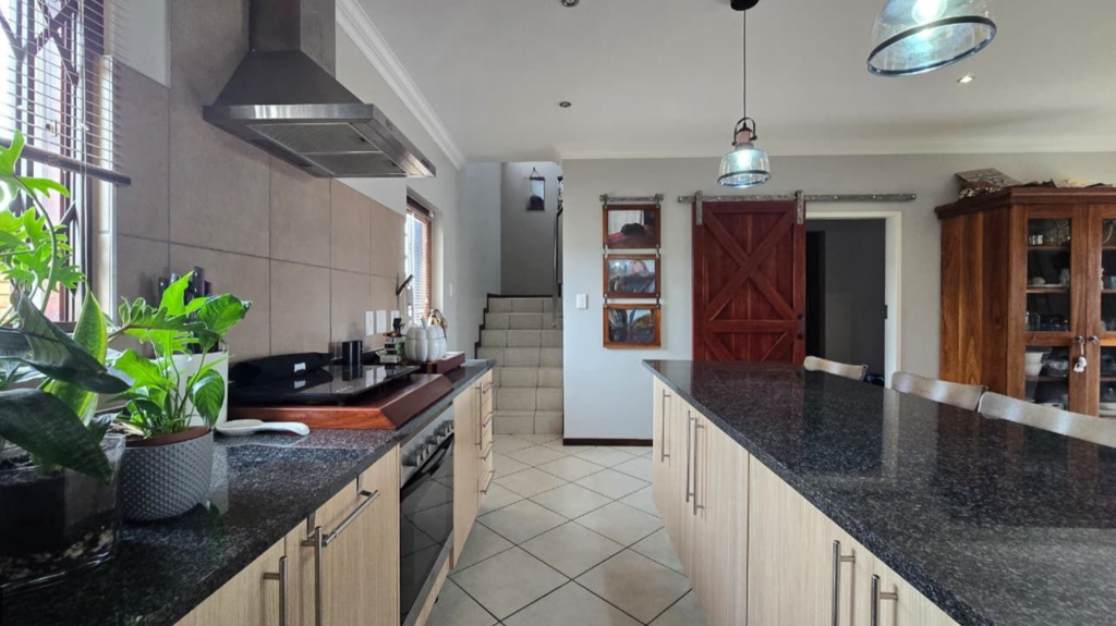 A light-filled living and dining area flows effortlessly into a modern designer kitchen featuring high-end finishes, ample cupboard space, and a separate scullery