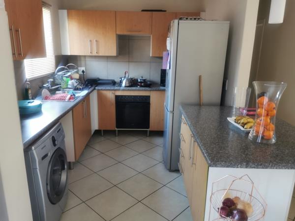 Inside, the functional kitchen is equipped with light wood cabinetry, speckled grey countertops, and tiled flooring for easy maintenance. It boasts integrated appliances including an oven, stove, fridge, and a washing machine, complemented by a practical breakfast bar or island. The adjacent lounge area offers a comfortable space for relaxation, benefiting from natural light.