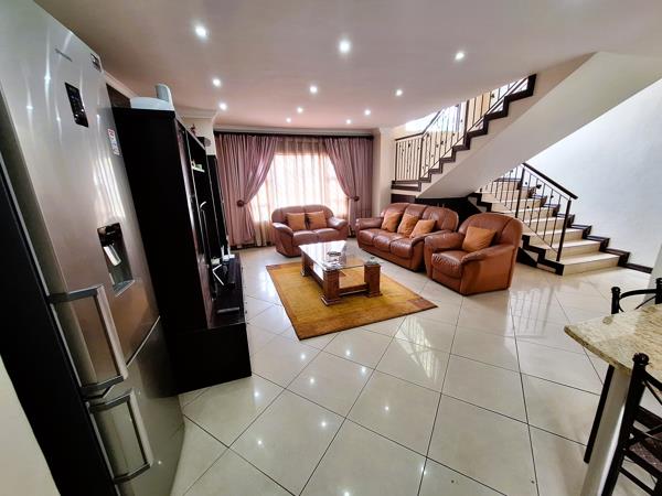 The expansive ground floor features an open-plan lounge and dining area that flows effortlessly onto a private patio with a built-in braai. A second open-plan living area adjoins the kitchen, ensuring you are always part of the action.
