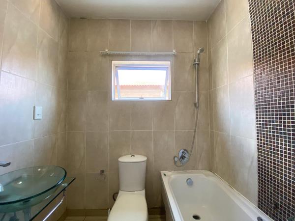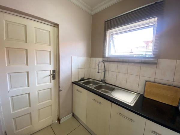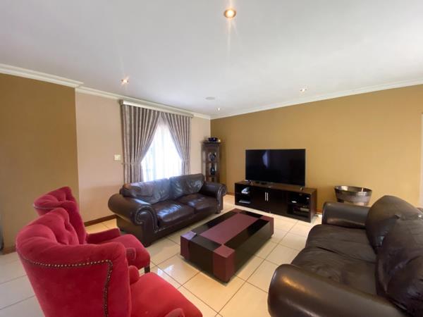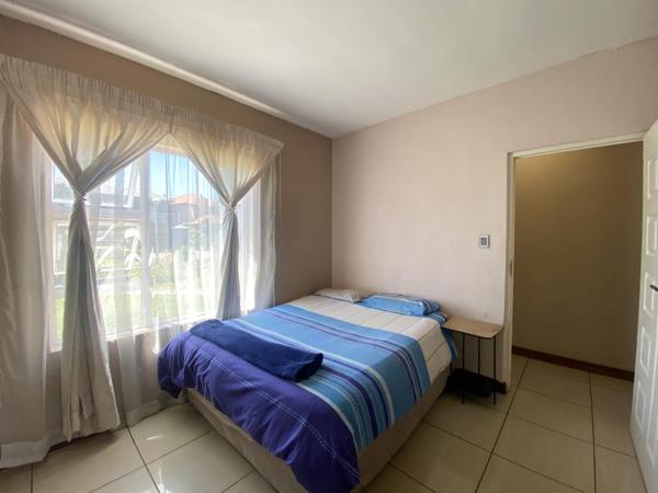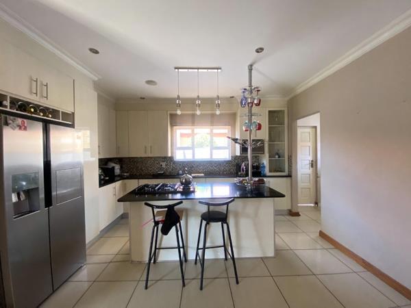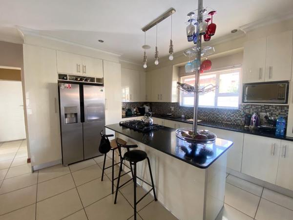 The open-plan lounge and dining area creates a warm and inviting atmosphere, complete with tiled flooring, a TV point, and easy flow onto the patio perfect for relaxed indoor-outdoor living. The modern open-plan kitchen is fitted with granite countertops, a breakfast nook, hob and oven, and includes a scullery and laundry area for added convenience.