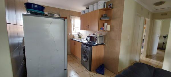 The home features three well-sized bedrooms with built-in cupboards, providing ample storage and comfortable living spaces. The open-plan lounge and kitchen create a warm, inviting atmosphere ideal for family living and entertaining. Tiled floors throughout ensure low maintenance and a neat, modern finish.