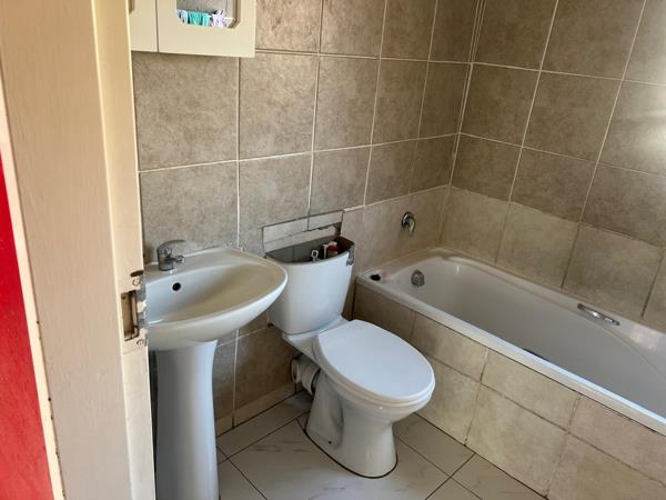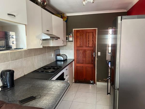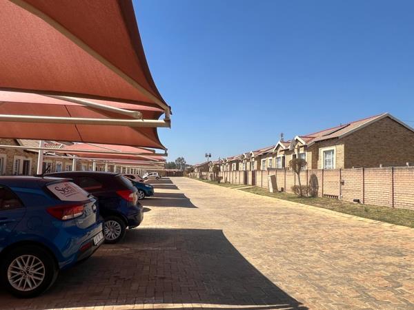 A 2 -bedroom townhouse in Celtic Park, Olievenhoutbosch. This property is located within a secure complex and features a bathroom with a shower, two parking areas with a carport, and a dining room that flows into the kitchen.