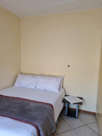 The single bedroom continues the theme of practicality with tiled flooring and light-colored walls, offering a clean and comfortable retreat. Natural light streams in through a window fitted with security bars, maintaining a secure environment. The property includes one dedicated parking space, adding to its convenience.