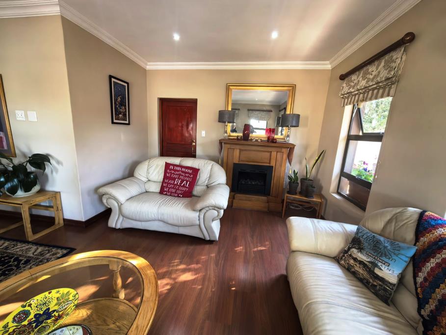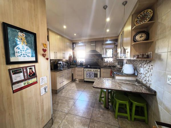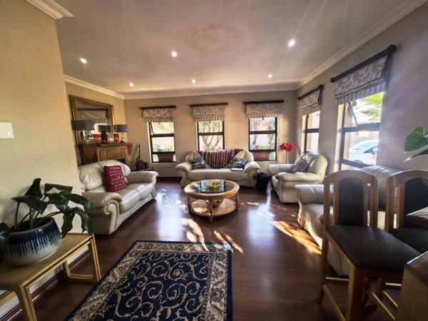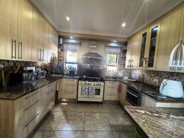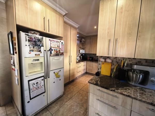 The kitchen is both functional and refined, fitted with granite countertops, a gas stove, a generous pantry cupboard, and a separate scullery with space for ironing. Direct access from the double garage leads conveniently into the home and offers additional built-in cupboard space. Accommodation includes three sunny, well-proportioned bedrooms, with the main bedroom featuring a walk-in cupboard, a full en-suite bathroom, and doors opening onto a private patio. The home further offers two full bathrooms, a separate guest bathroom, a study nook, prepaid electricity, excellent security features, and an overall layout that makes it a truly inviting family home designed for comfortable living and memorable gatherings.