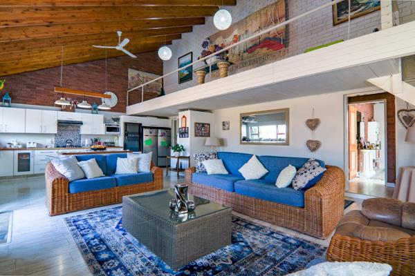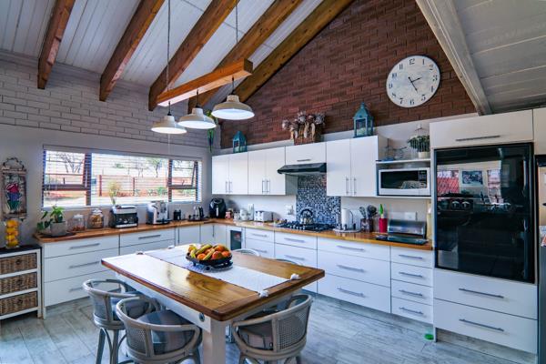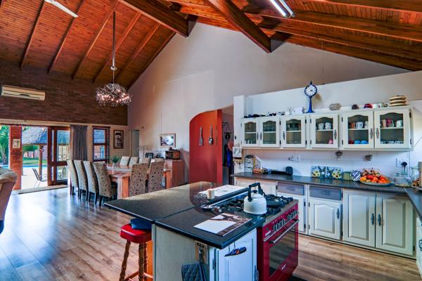 The interior showcases a spacious open-plan layout, featuring high vaulted wooden ceilings and charming exposed brick accents that add a unique touch. With two distinct lounges and two dining rooms, there is abundant space for both formal gatherings and relaxed family time. The property includes two well-appointed kitchens, one featuring a central island, gas hob, and built-in oven and microwave, ensuring culinary convenience. Natural light floods these areas through large windows and glass doors, enhancing the sense of openness, complemented by air conditioning for year-round comfort.