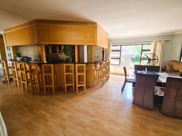 The living areas include a spacious lounge and dining room, complemented by a beautiful built-in bar ideal for entertaining. The kitchen impresses with granite tops, a gas hob with centre island, eye-level oven, ample cupboards, and a separate scullery/laundry.