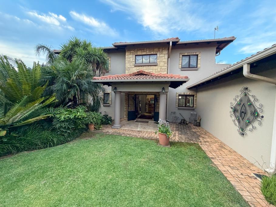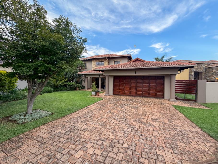 Discover an unparalleled lifestyle within the esteemed Raslouw Manor security estate in Centurion, South Africa. This magnificent residence, boasting a generous 329 sqm under roof on a 614 sqm erf, immediately captivates with its sophisticated kerb appeal. The meticulously maintained exterior features elegant stone cladding, warm terracotta roof tiles, and a lush, manual irrigated garden, complemented by a spacious paved driveway leading to a double automated garage with charming wooden doors.