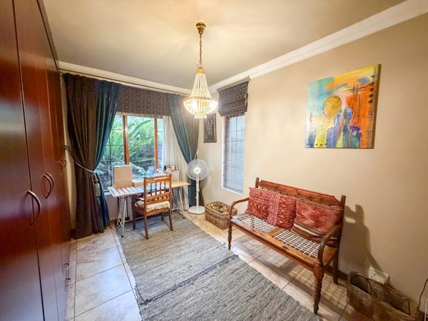Outdoor living is elevated with a private balcony and a charming patio, ideal for enjoying the serene garden. The property is nestled within a secure estate, offering 24-hour security, access gates, security gates, and burglar bars for ultimate peace of mind.