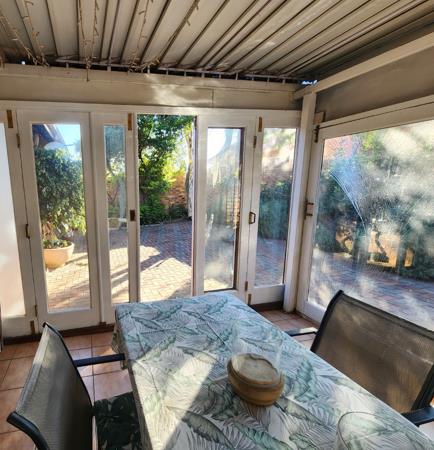The patio has been enclosed with glass doors and is functioning as a dining room.