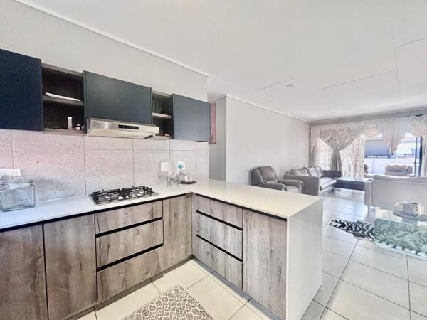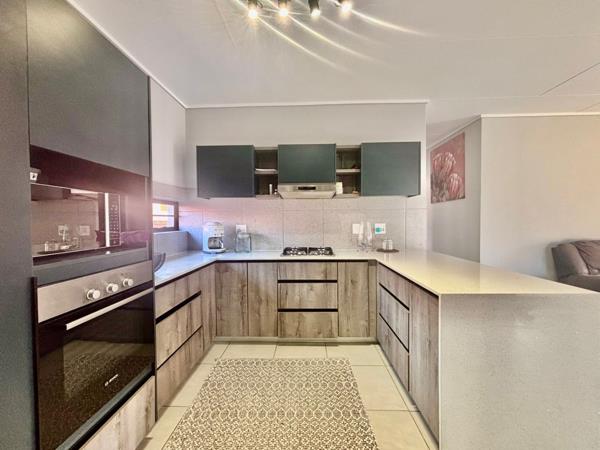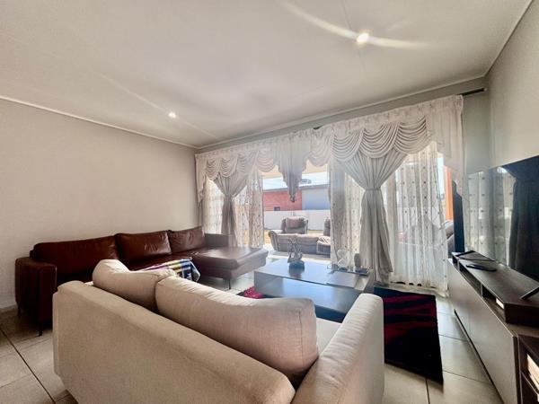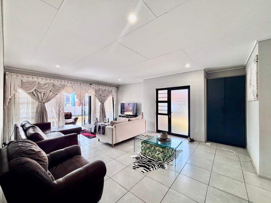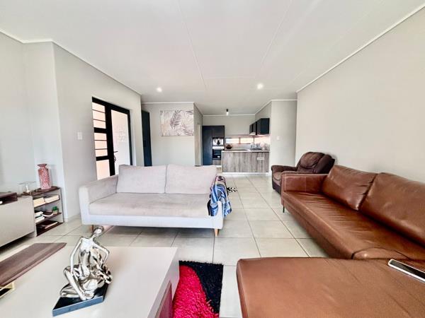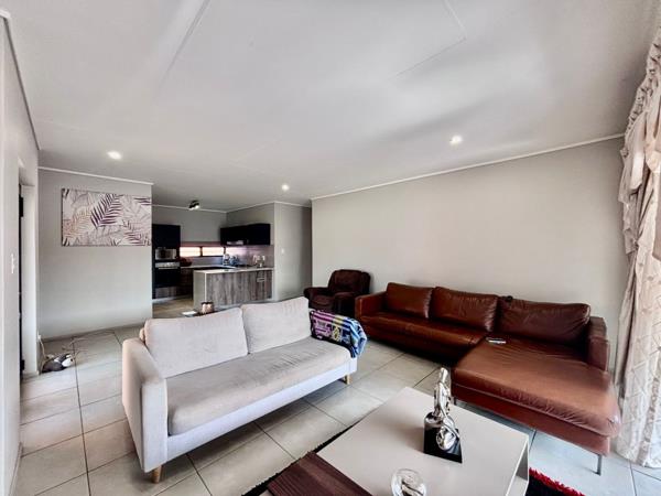 The living room invites the outdoors in through large sliding doors, leading to a charming patio complete with a built-in braai and a beautifully landscaped gardenan ideal setting for gatherings with family and friends.
