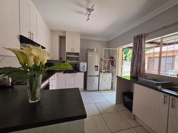 * Modern kitchen with ample cupboard space, breakfast nook, and space for either a double fridge/freezer and one appliance, or a single fridge/freezer and two appliances