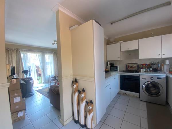 Upon entering, you will find a well-appointed kitchen to your right, featuring ample built-in cupboards, melamine countertops, an under-counter oven with a hob, a washing machine connection, and space for a single-door fridge. To the left, the dining room seamlessly flows into a sunny lounge that opens to a private back garden with a built-in braaiperfect for outdoor entertaining.