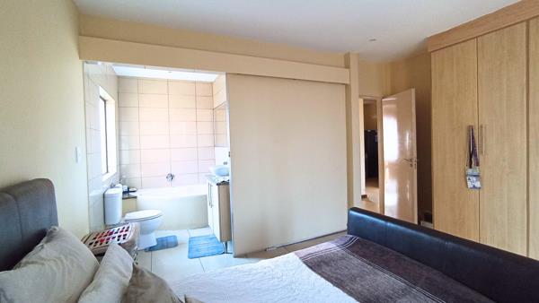 Main Bedroom Built-in cupboards, an en-suite bathroom bath, toilet, and basin, and direct garden access through sliding doors.