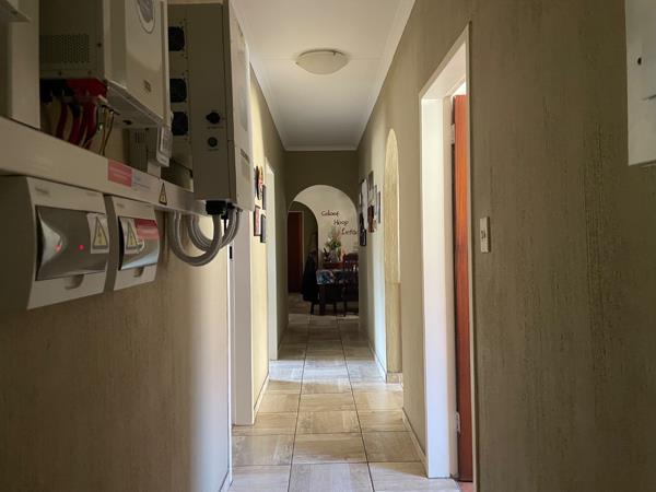 Security is a priority, with features including a perimeter wall, access gate, alarm system, and burglar bars, ensuring peace of mind. This home also embraces modern sustainability with installed solar panels and a battery inverter, significantly reducing electricity costs and providing backup power. High-speed fibre internet connectivity is available, meeting contemporary digital demands.