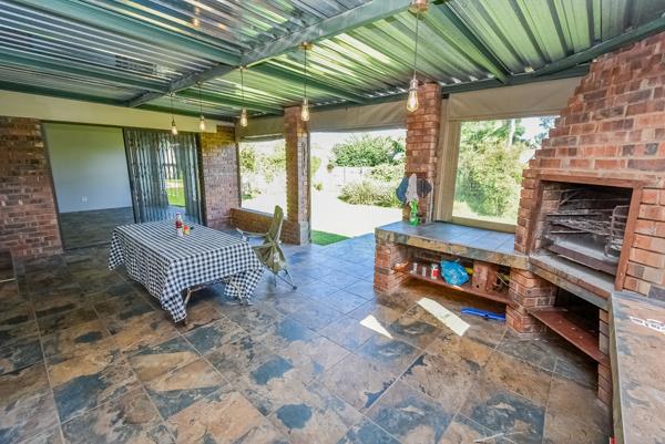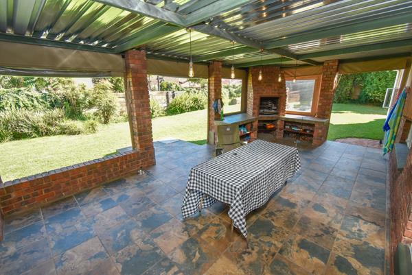 The open-plan living areas flow seamlessly, creating a warm and inviting atmosphere that spills out onto a covered patio with built-in braaiperfect for entertaining while overlooking the sparkling pool and private garden.