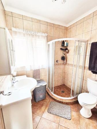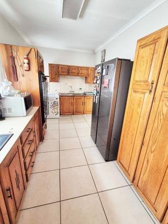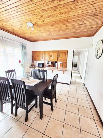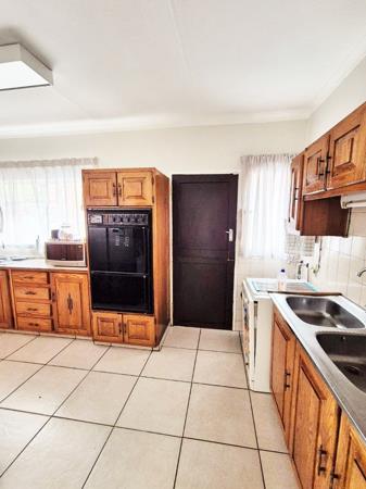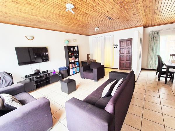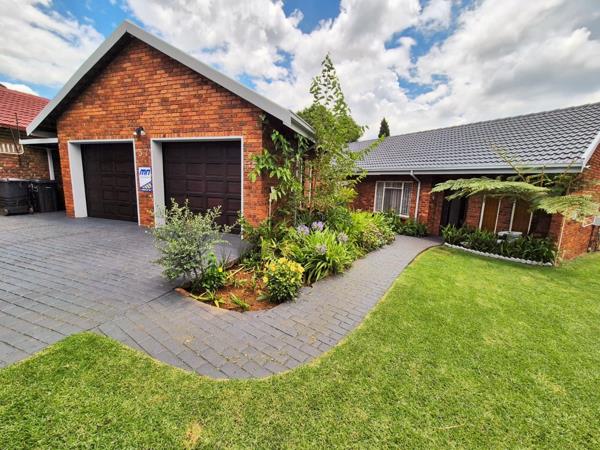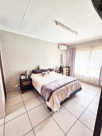 Accommodation comprises three bedrooms, with the main bedroom featuring an en-suite bathroom for added privacy. One bedroom is equipped with an air conditioning unit, and all benefit from natural light and tiled floors. The property''s outdoor amenities are a highlight, featuring a large swimming pool, a spacious garden with mature trees, and a comfortable enclosed lapa with a built-in braai, ideal for outdoor entertaining. Paving around the pool area and a well-kept garden enhance the outdoor apearance.