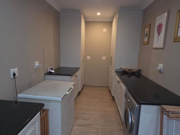 The kitchen is both sleek and practical, fitted with granite surfaces, a centre island, and a separate scullery that keeps everyday living neatly tucked away.