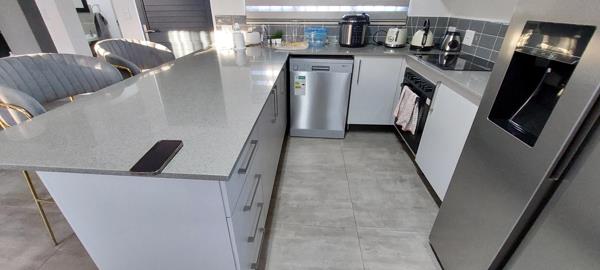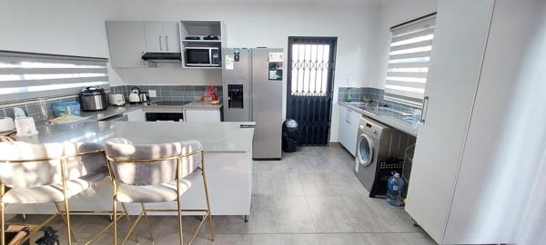 Step into a stylish modern kitchen featuring a scullery, double-door fridge space, breakfast nook, and ample room for your appliances. The open-plan living area effortlessly serves as both a lounge and dining space, ideal for family living and entertaining. A guest toilet is conveniently located on the ground floor.