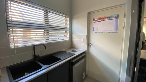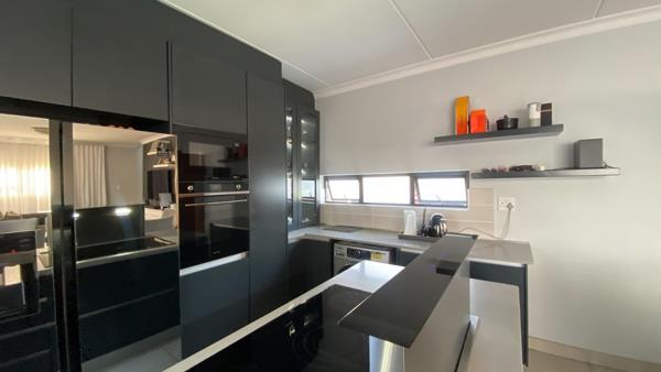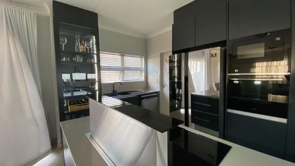 The home features tiled floors throughout and a spacious open-plan kitchen fitted with built-in cupboards, a central island, and premium owner-installed Smeg electric stove, oven, and microwave. A granite basin adds a sleek, contemporary touch to the kitchen. The open-plan layout flows effortlessly into the living area, ideal for comfortable family living and entertaining. A guest toilet is conveniently located on the ground floor.